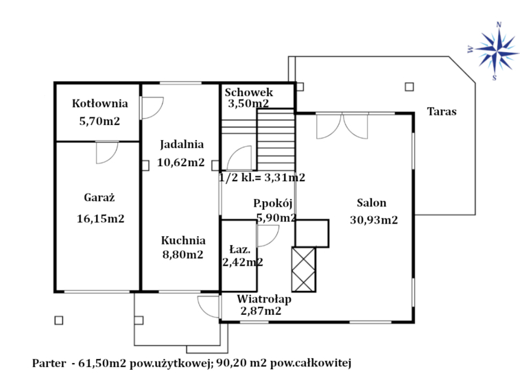 Na parterze o powierzchni całkowitej 90,20m2, użytkowej( bez garażu i kotłowni) 61,50m2 znajduje się: