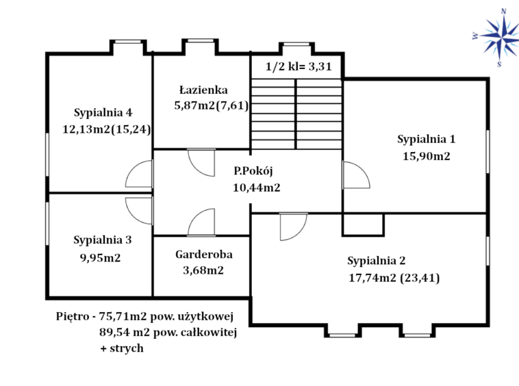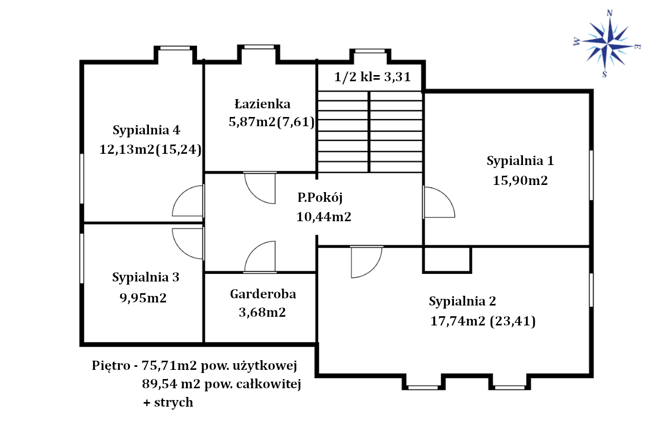 Piętro o powierzchni całkowitej 89,54m2, użytkowej 75,70m2 składa się z: